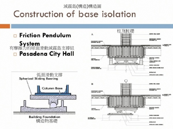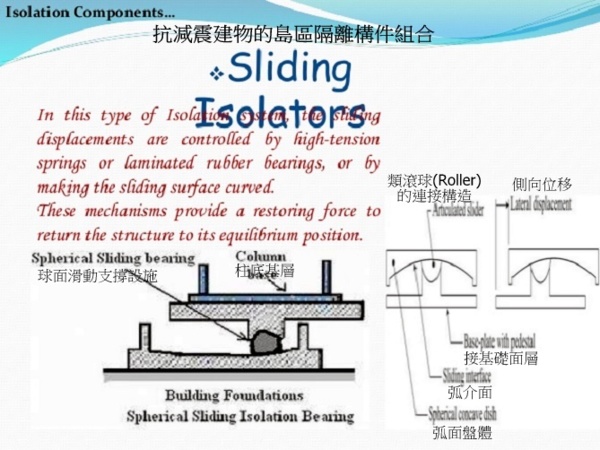 有摩擦力的球面滑動減震島支撐組組合(Friction Pendulum Bearing base isolation system);使柱’樑合理減肥,構造物使用空間美化,促成構造物荷重均勻分布至基礎層,增加構造物使用安全.原理機構如;