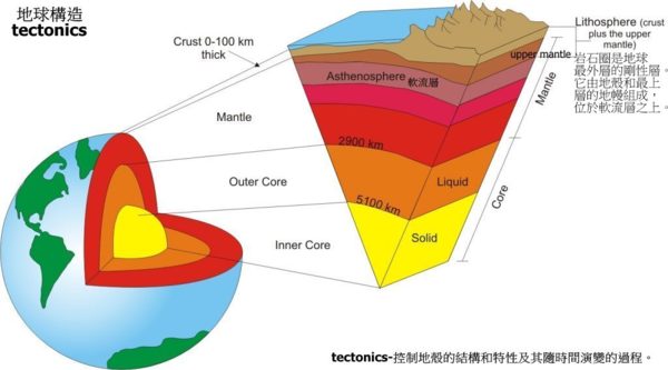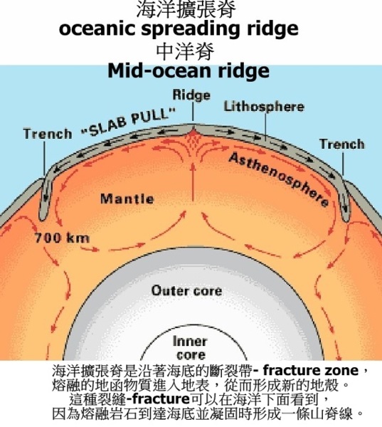 岩石圈(lithosphere)是由冷而剛硬的岩石所組成,並碎裂成七大板塊及十個小板塊,漂浮在具流動性的【軟流圈-Asthenosphere】上方,軟流圈的熱對流運動,帶動上方的【板塊-tectonic plates- lithosphere-岩石圈】運動。地球內部有許多熱對流系統,所以每個板塊移動的【速率】和【方向】不一樣,彼此產生相對運動,因而造成【海底擴張】及【大陸漂移】的現象。
