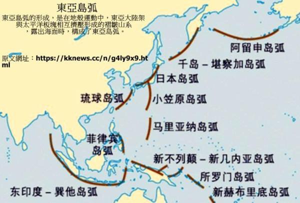 板塊造山的觀點認為,台灣島是東亞島弧中的一個環節,它的形成過程,與東亞島弧的形成、發展有著密切的關係。(東亞島弧即指東亞大陸架與太平洋西部海溝之間的島弧,包括千島群島、日本群島、琉球群島、台灣島及其附近小島、菲律賓群島等。)東亞島弧的形成,是在地殼運動中,東亞大陸架與太平洋板塊相互擠壓形成的褶皺山系,當它露出海面時,便構成了東亞島弧。