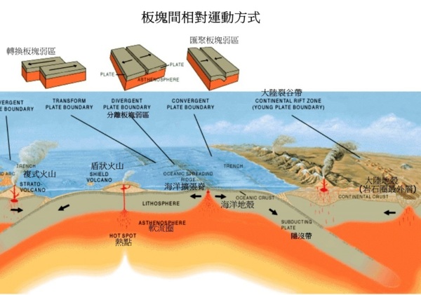 按板塊間相對運動方式,可將板塊弱區(邊界)分為三種類型,即分離型(DIVERGENT PLATE BOUNDARY)、匯聚型(CONVERGENT PLATE BOUNDARY)以及轉換斷層型(TRANSFORM PLATE BOUNDARY或平移型)。匯聚型又可分為俯衝型和碰撞型。