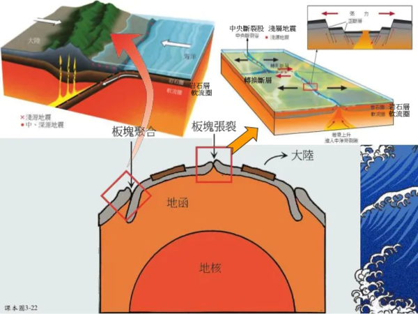 科學家綜合【大陸漂移說】及【海底擴張說】,提出【板塊構造學說】。板塊會因為地函的熱對流作用,而導致板塊運動。