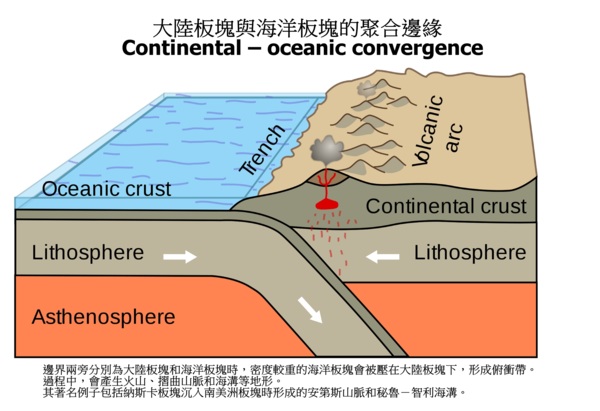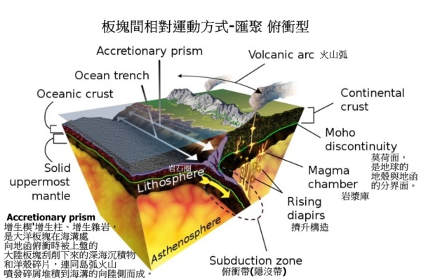 熱對流在板塊【隱沒帶- subduction zone】下降,將板塊帶回【軟流圈】,並且帶動上方的板塊互相靠近,因此容易產生碰撞,即形成【聚合性- CONVERGENT PLATE BOUNDARY】板塊。台灣和喜馬拉雅山為【聚合性】板塊。