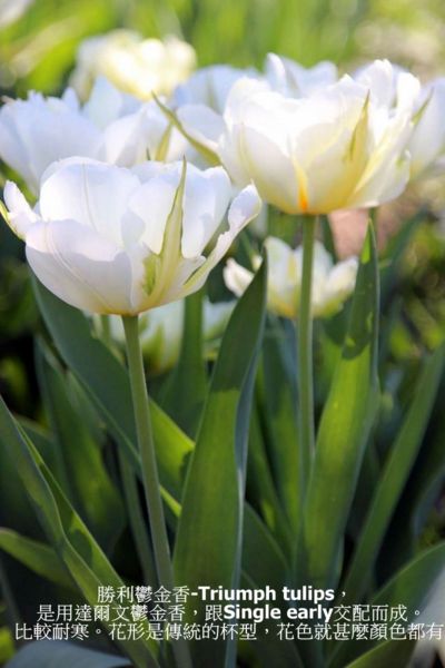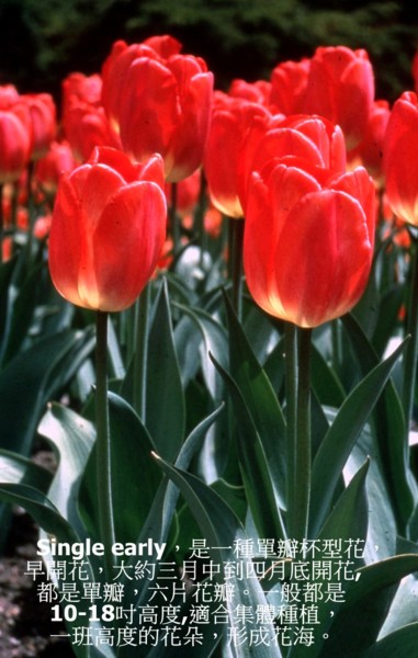 Single early,是一種單瓣杯型花,早開花,大約三月中到四月底開花,都是單瓣,六片花瓣。一般都是10-18吋高度,也就是一尺到一尺半高度。(最高半米)。很適合集體種植,一班高度的花朵,形成花海。