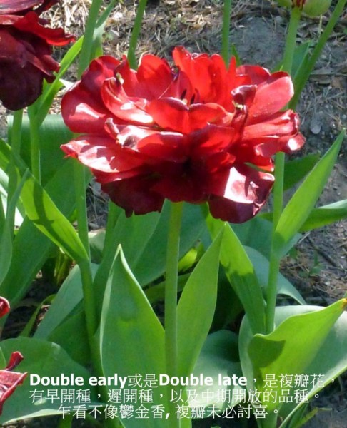 Double early或是Double late,是複瓣花,有早開種,遲開種,以及中期開放的品種。複瓣花剛推出時很多人不喜歡,因為乍看不像鬱金香。也不像玫瑰花,花瓣越多越好看,鬱金香剛相反,複瓣未必討喜。