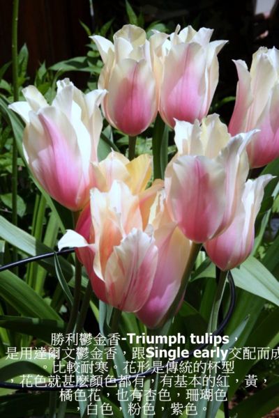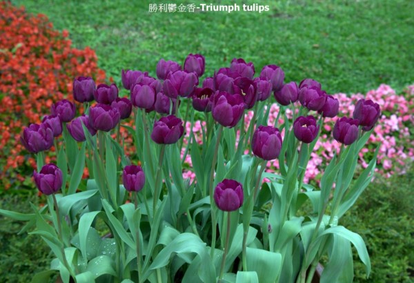 勝利鬱金香-Triumph tulips,是用達爾文鬱金香,跟Single early交配而成,開花期是中期,(四月底開花)。比較耐寒。花形是傳統的杯型,花色就甚麼顏色都有,特別是新式的品種,有基本的紅,黃,橘色花,也有杏色,珊瑚色,白色,粉色,紫色,以及很多像是塗上去的水彩顏色,或是有花邊的圖案等等,士林官邸鬱金香展的主角。枝梗堅挺,而且花朵持久,一些有香味,很適合插花。其中有。在熱帶地區當作一年生種植。