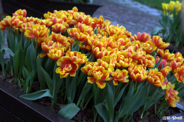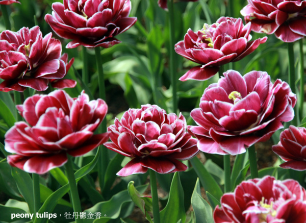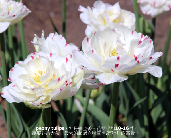 peony tulips,牡丹鬱金香。花瓣很多,複瓣非常大朵,有如牡丹花一樣大。最大的超過六吋直徑,有牡丹的富貴。花梗平均10-16吋,可能需要支撐,因為花朵的重量可能讓枝梗下垂。花瓣也不喜歡被雨淋,種的時候最好有一些遮擋。