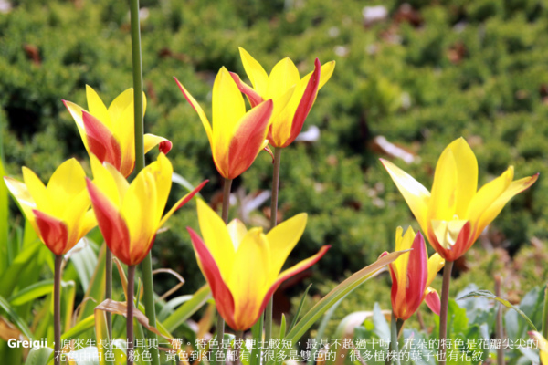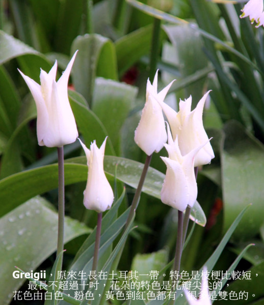Greigii,原來生長在土耳其一帶。特色是枝梗比較短,最長不超過十吋,所以適合石頭花圃,也適合盆栽。花朵的特色是花瓣尖尖的,花色有白色,粉色,黃色到紅色,很多是雙色的。很多植株的葉子也有花紋。