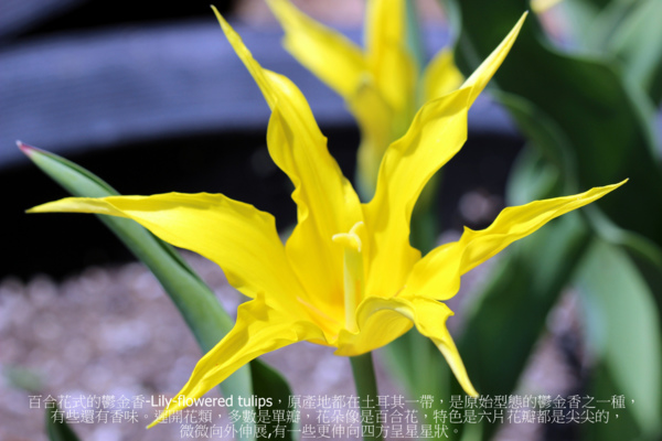 百合花式的鬱金香-Lily-flowered tulips,原產地都在土耳其一帶,是原始型態的鬱金香之一種,有些還有香味。都是遲開花類,也就是都在五月開花的。多數是單瓣,花朵像是百合花,特色是六片花瓣都是尖尖的,並且微微向外伸展。有一些更伸向四方呈星星狀。枝梗一般在14-24英吋,最高的有32吋。