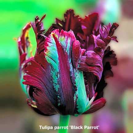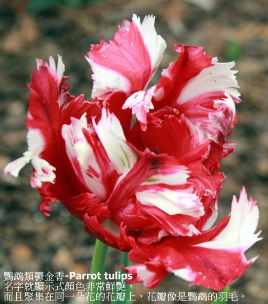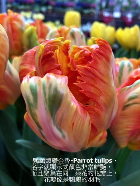 鸚鵡類鬱金香-Parrot tulips,名字就顯示顏色非常鮮艷,而且聚集在同一朵花的花瓣上,花瓣像是鸚鵡的羽毛。杯狀的花朵很大,枝梗很長。花朵因為很特出,最好是單獨種在顯眼的地方,或在一群白色’淺黃色的鬱金香或是水仙花為背景中種植。