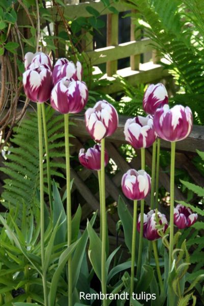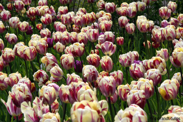 Rembrandt tulips是以畫家林布蘭·范萊因Rembrandt van Rijn為名。以其為名或是正值鬱金香狂熱中。這種鬱金香的花瓣有紫色為主的直紋,是當初有一種病毒造成,這種病毒由蚜蟲帶來,之後形成直紋。所以還有一個名字:broken tulips,但因為也很漂亮,因此保留下來。不過現代鬱金香已不會有這病毒。