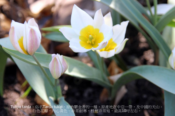Tulipa tarda,俗名Tarda tukip,原始鬱金香的一種,原產地在中亞一帶,及中國的天山。非常耐寒,枝梗非常短,最高10吋左右。很適合石頭花園或盆栽。白色花瓣,內心黃色。