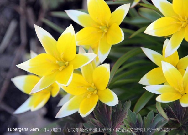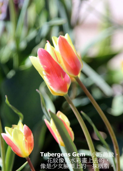 Tubergens Gem,很受歡迎,因為小巧趣緻,而花紋像是水彩畫上去的,像是少女臉頰上的一抹胭脂。枝梗最高只有十吋(30公分),很適合種在樹下,水池邊。或是石頭花園。