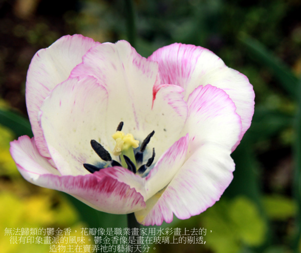 非常美麗,但是無法歸類的鬱金香,花瓣像是職業畫家用水彩畫上去的,很有印象畫派的風味。