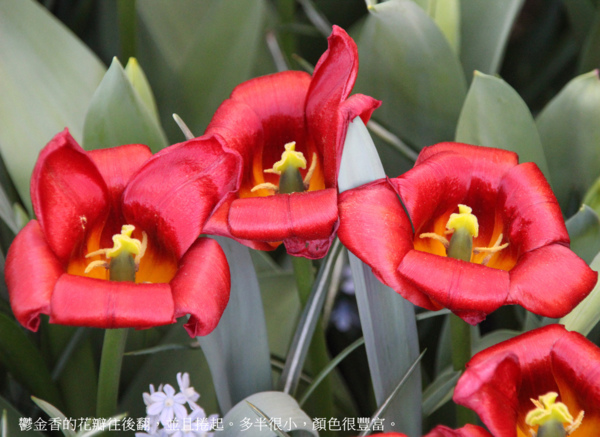 鬱金香的花瓣往後翻,並且捲起。多半很小,顏色很豐富。