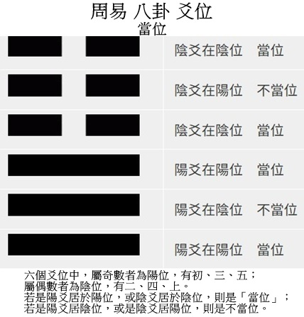 若是陽爻居於陽位,或陰爻居於陰位,則是「當位」;若是陽爻居陰位,或是陰爻居陽位,則是不當位。