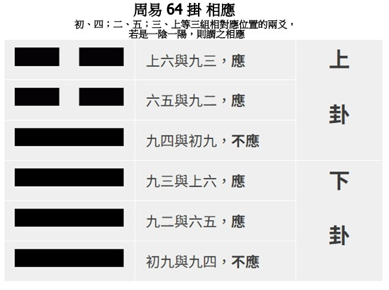 易經六十四卦,每卦都有上下卦;上下兩卦之間,初、四;二、五;三、上等三組相對應位置的兩爻,若是一陰一陽,則謂之相應;反之,若是兩爻都是陰,或是兩爻都是陽,則是不相應。相應者為吉,不相應者為凶。
