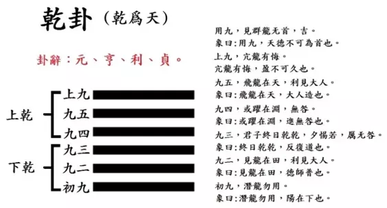 《象》曰:天行健,君子以自強不息。潛龍勿用,陽在下也。見龍在田,德施普也。終日乾乾,反復道也。或躍在淵,進无咎也,飛龍在天,大人造也。亢龍有悔,盈不可久也。用九,天德不可為首也。