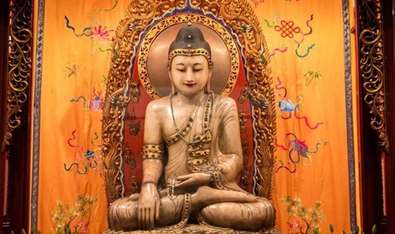 座佛高195公分,由整塊玉石精雕而成,姿態是釋迦摩尼佛成道法相,在袈裟邊緣及右臂飾有翡翠、瑪瑙等寶石。