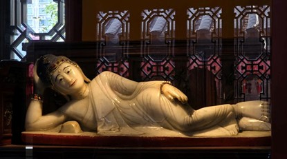慧根法師當年留下的玉佛,身長96公分,由整塊緬甸玉雕成,呈現「吉祥臥」姿態,臥佛髮髻中藏有一粒寶珠。