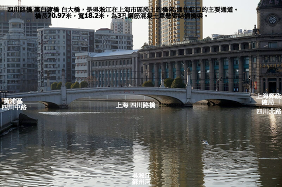 四川路橋,是吳淞江在上海市區段上的橋梁,通往虹口的主要通道。橋北面為虹口區四川北路,橋南面為黃浦區四川中路,橋長70.97米,寬18.2米,為3孔鋼筋混凝土單懸臂結構橋梁。橋址處原為二壩郎渡口,清光緒四年(1878年),工部局在該渡口處建造寬3.66米的木橋一座,名裏白渡橋、又名白大橋。橋北側有建於1922年的上海郵政總局大樓,因此該橋又俗稱郵政局橋。1943年,該橋被命名為四川路橋。