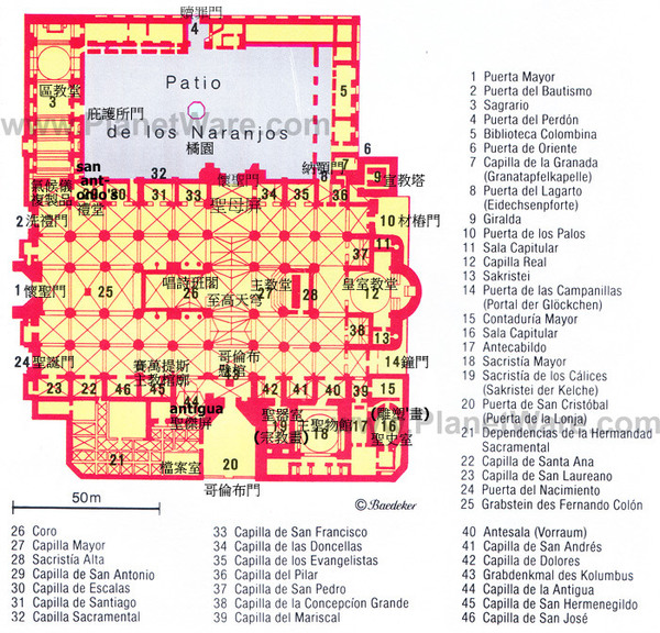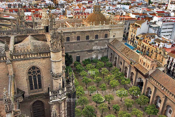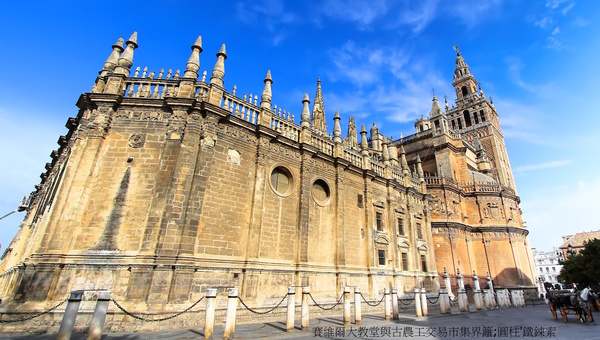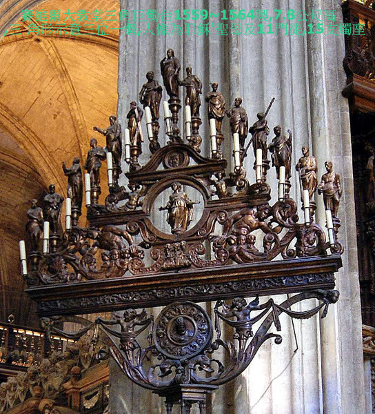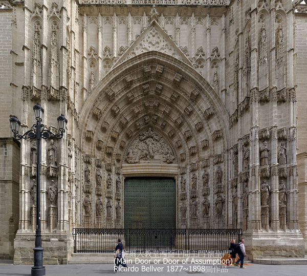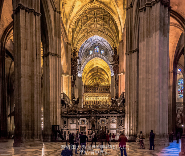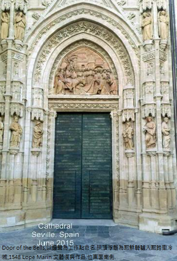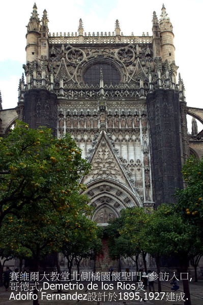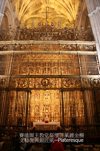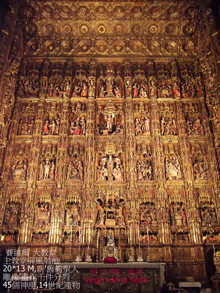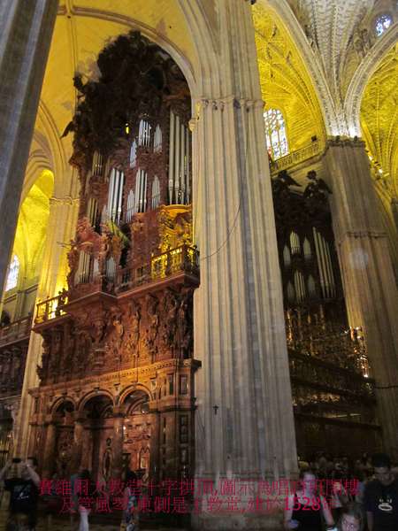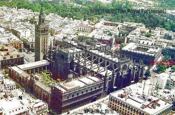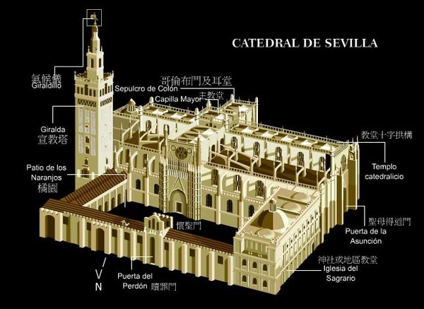 西班牙最著名的《塞維亞大教堂》次於羅馬聖彼德’倫敦聖保羅大教堂,14世紀末具雄心宗教狂熱統治者賦予自身任務,結合原來是摩爾人的清真寺,擴建為教堂,卓越宏偉輪廓執行於1401~1506,費時4世紀始達現貌,不同年代築造,陳現阿爾摩哈德(Mudejar)’哥德’後哥德’文藝復興銀匠’文藝復興嬌飾’巴洛克’近代哥德風,為矩形,長116公尺,寬76公尺,最高處是中心,達56公尺.