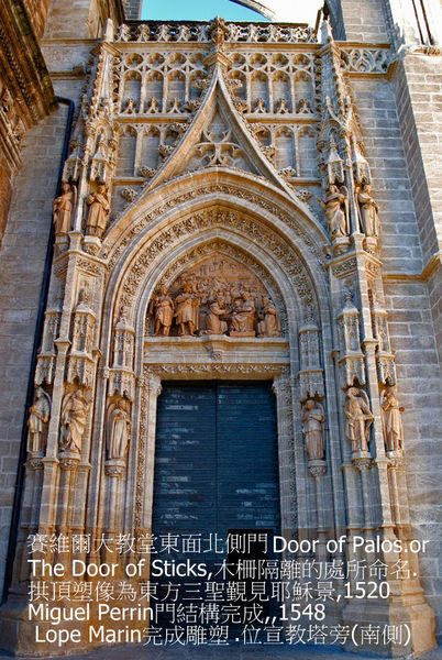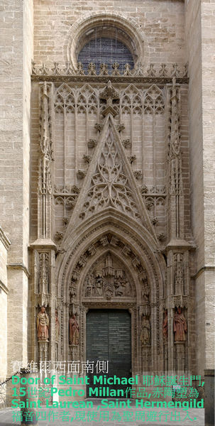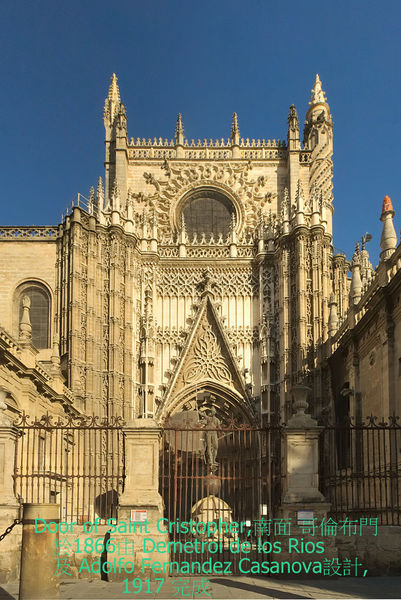 南面Prince’s Door(The Door of Saint Critopher)哥倫布門, 1866原設計為建築師Demetrio de los Rios, 接續加入Adolfo Fernandez Casanova於1895完成設計,1917完成施工.有複製”Giraldillo”氣候儀擺設.