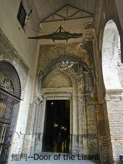 Door of the Lizard—鱷魚門;因拱上懸有相傳埃及蘇丹贈阿方索十的禮品—鱷魚標本(實景為木雕).也稱East Door,位橘園東側.