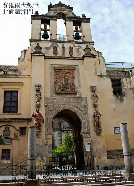 Door of the Forgiveness 贖罪門;16世紀前為Calle Alemanes街區進橘園的出入口,維持著穆斯林樣貌,協議後納入教堂,16世紀由 Miguel Perrin雕塑聖像及拱上贖罪圖,馬蹄形拱頂植物樣貌泥飾由Bartolomé López創作.