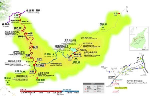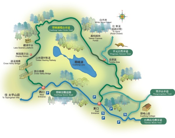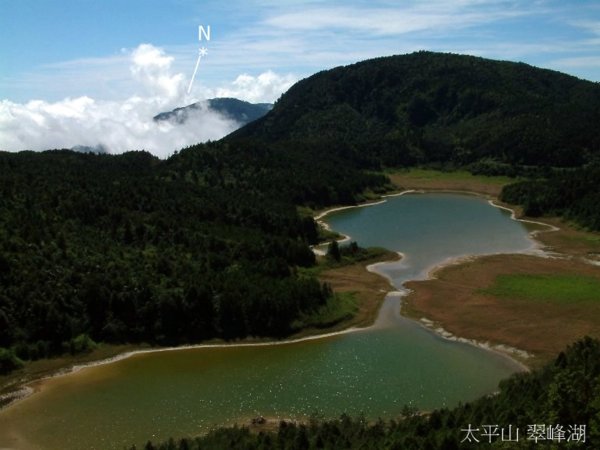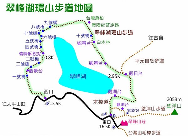 翠峰湖道近太平山停車場,往東北方向,翠峰湖近望洋山,西傍三星山,東俯大元山.主要景緻為翠峰湖環山步道,東向衍伸出台灣山毛櫸步道,東北向有望洋山步道’平元自然步道. 翠峰湖環山步道全長3.9公里,10座木橋可為里程碑(目前東’西入口步道均有修行養山段), 步道大部分路段罕有人行活動,加上受到地被植物、枯枝落葉層、苔蘚植物等覆蓋保護.氣溫低、空氣溼潤,長年籠罩於濃霧細雨之中,造就豐富的苔原生態,苔原區200 公尺區段多為低溼小平地,溪溝內苔蘚類生長茂密,翠綠欲滴、質地柔軟、吸水力強的泥炭蘚遍地叢生,與紅檜林形成鮮明對比。苔原植物相,「溼」情畫意,永續保鮮。800公尺處原生植物展示解說,解說展示台原為機關車加油站,裏外配合情境擺設,用心. 走完也是森林浴.1~4月為枯水期,陳現兩潭面,主因東岸為沙頁岩,風化破碎後滲出湖水,露出廣大湖岸,亦為生態的一環.得山得水,仁智雙全.