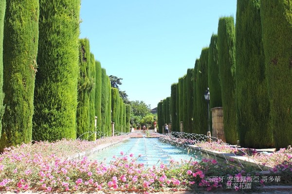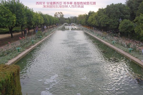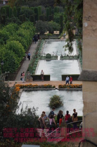基督教君主城堡 庭園(水池北側為馬場),承繼摩爾 哈里法的庭園思維,哥多華失守,再建格瑞那達的拍拖庭園(Generalife)為典型.