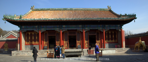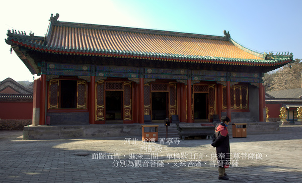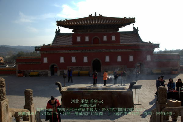 魚貫出站,普通的像台北舊站,站前廣場10公尺寬縱深30’40公尺,車站路上人車洶湧,顯單向3線道不足了.都市化的過程似乎對人潮’交通流量預測總是不足,普寧寺在舊市區北側,往北離開車站街,沿武烈河東岸,一下開闊’開朗了.觀光淡季不塞不擠,河邊有漢’唐色調’外型的獨棟2樓別墅,承德人稱頂級住宅,遑讓北台.4個鐘點要逛普寧寺’普陀宗乘之廟’須彌福壽之廟’避暑山莊.旅遊書真小看了承德,避暑山莊愜意瀏覽2天不嫌多.開始執行不可能計畫.