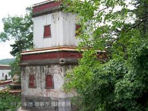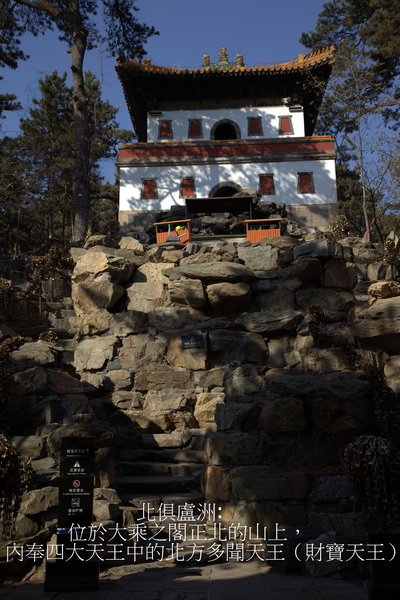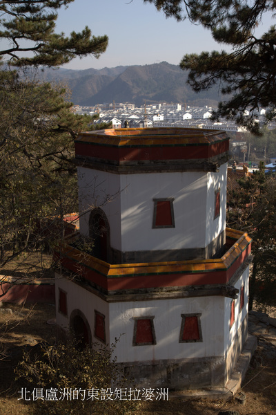 3.2北俱盧洲:位於大乘之閣正北的山上,內奉四大天王中的北方多聞天王(財寶天王),北俱盧洲上下均為白色,各開一層藏式紅色盲窗,上下層的中央各開一券門,內有磴道。