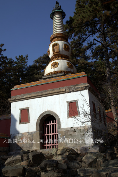 西北角呈圓形的黃白色塔上飾法輪,名叫大圓鏡智塔。