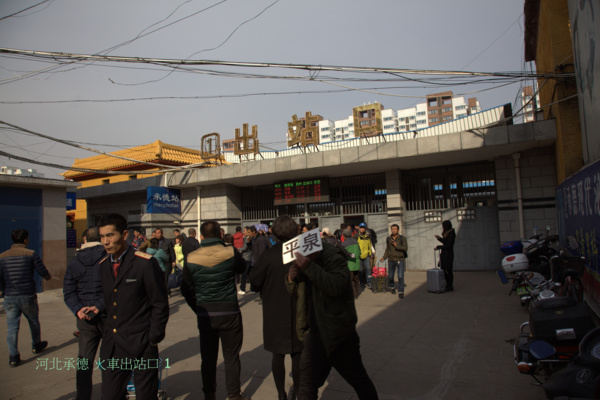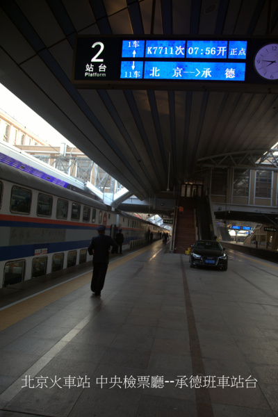 0756北京往承德空調硬座火車,詢問台建議為應安檢’人潮提早小時進站候車,謹慎抵達北京火車站,沒人潮,安檢順暢,輕鬆瀏覽起建物內觀,大啖羊肉香菜餃,味可,秋木耳爽口,價也比美台北,屬24小時經營.要午後1點到承德,4個時程要逛外八廟’避暑山莊,趕.買點水果當午餐,車上食,節約時間.特別買香蕉,好了解台蕉外的品質及價格;評價是經濟實惠,經貿觀點台灣要努力.近5個鐘點車程,盯著窗外,出北京就綠意漸少,可以看到造林的區域,站與站間愈北愈是乾枯色調,站區域以往經濟活動消退,站也落魄,秋的蕭瑟.