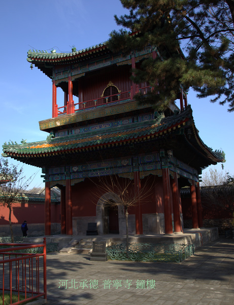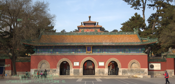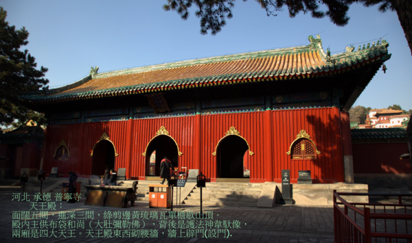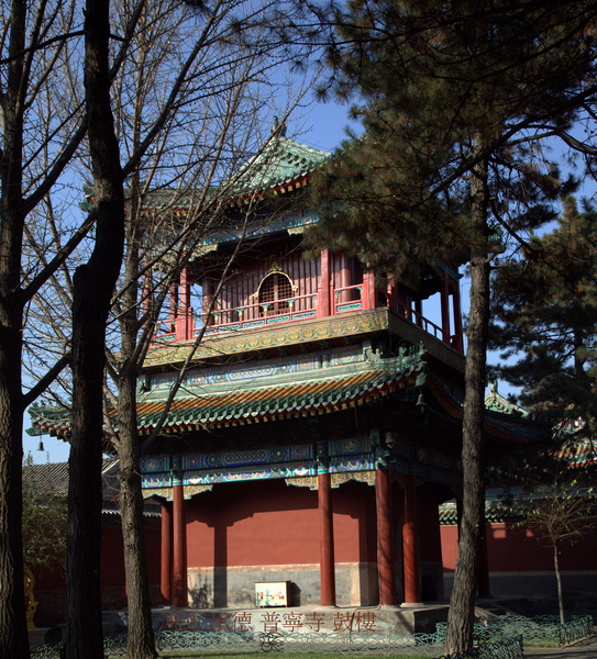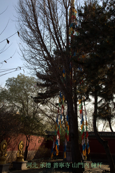 2.山門:面闊五間,單檐歇山式琉璃瓦頂,內有哼哈二將塑像。「普寧寺」三字為乾隆帝御題。山門兩側有東西掖門。山門內左右各有寶幢一根。