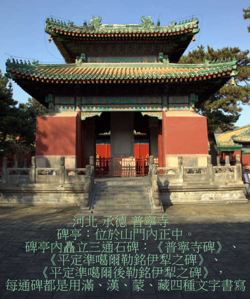 3.碑亭:位於山門內正中。碑亭內矗立三通石碑:《普寧寺碑》、《平定準噶爾勒銘伊犁之碑》、《平定準噶爾後勒銘伊犁之碑》,每通碑都是用滿、漢、蒙、藏四種文字書寫。
