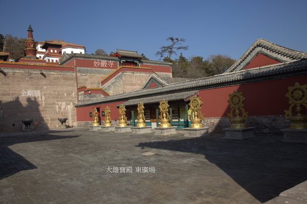 6.妙嚴室:位於大乘之閣東南,是一個院落。院內南為院門,北面正房為卷棚硬山頂,青磚灰瓦,東、西、南為遊廊,西遊廊西側的院牆上開門通往大乘之閣院落。出南側的院門有東、西蹬道可下至普寧寺東院的裙房院落。妙嚴室為乾隆帝來寺瞻禮時的休息之所。