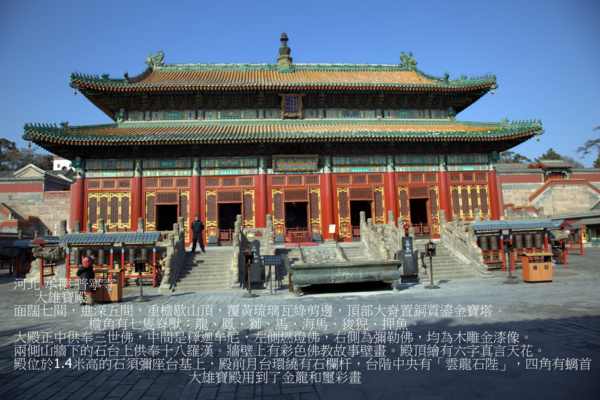 5.大雄寶殿:面闊七間,進深五間,重檐歇山頂,覆黃琉璃瓦綠剪邊,頂部大脊置銅質鎏金寶塔。檐角有七隻脊獸:龍、鳳、獅、馬、海馬、狻猊、押魚。大殿正中供奉三世佛,中間是釋迦牟尼,左側燃燈佛,右側為彌勒佛,均為木雕金漆像。兩側山牆下的石台上供奉十八羅漢。牆壁上有彩色佛教故事壁畫。殿頂繪有六字真言天花。殿位於1.4米高的石須彌座台基上,殿前月台環繞有石欄杆,台階中央有「雲龍石陛」,四角有螭首。大雄寶殿用到了金龍和璽彩畫。