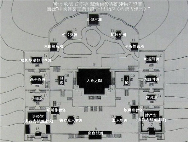 普寧寺位於避暑山莊東北的武烈河畔,因寺內有一尊金漆木雕大佛,故亦稱「大佛寺」。普寧寺建於清朝乾隆二十年(1755年),乾隆二十四年(1759年)建成。清廷平定了厄魯特蒙古準噶爾部(領地西藏至新疆天山南北)台吉達瓦齊叛亂,新疆統一後,在避暑山莊為厄魯特四部貴族封爵,乾隆帝仿西藏桑鳶寺(桑耶寺、三摩耶廟;赤松德贊;唐朝時吐蕃第三十七代贊普<非唐文成公主生育>, 弘揚佛教,請印度僧人蓮花生為其建寺傳法,蓮花生施展法術,在掌心中出現一座寺廟,真是“不可想像”即桑鳶寺)的形制建造普寧寺。乾隆帝建普寧寺是效仿康熙帝解決喀爾喀蒙古問題之後在多倫諾爾建匯宗寺的做法。「普寧寺」意取邊疆民族「安其居,樂其業,永永普寧」之意。