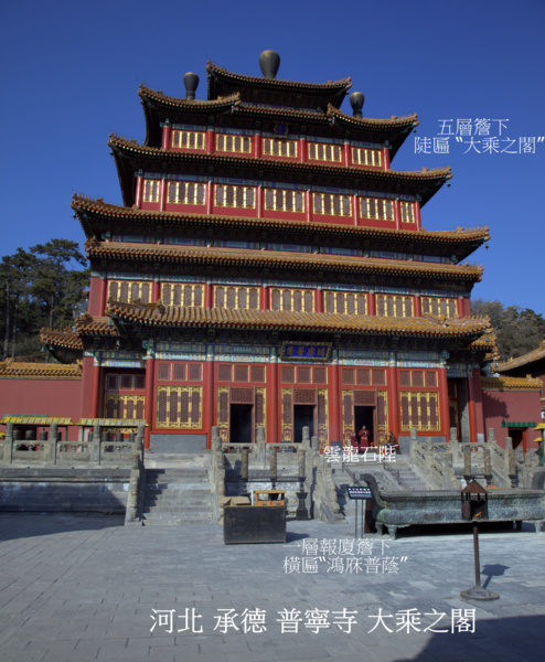 為整個寺院的最主要建築。大乘之閣下部是1.6米高的須彌座,前帶月台,周圍有石欄板加雲龍柱,南出三階,中嵌浮雕雲龍石陛,東西各出一階。大乘之閣面闊七間,進深五間,五頂攢尖聚攏式樓閣,南面出六層檐(第二層為假檐),東西兩面出五層檐,南面和東西兩面各自下建抱廈,東西兩面山牆開有藏式梯形盲窗,北面依山勢而為四層檐,檐下均置斗拱飾彩畫,檐上覆黃琉璃瓦。每層逐漸內收,第四層收為面闊五間、進深三間。第五層四角對稱設四個方亭,頂覆黃琉璃瓦,銅鎏金寶頂,第六層正中設一大方亭,頂覆黃琉璃瓦,大銅鎏金寶頂,五個方亭構成了整個建築的頂部,四個小寶頂護衛中央的大寶頂。大乘之閣南面第五層檐下懸掛滿、蒙、漢、藏四種文字的「大乘之閣」雲龍陡匾,第一層抱廈檐下懸掛乾隆帝御筆「鴻庥普蔭」雲龍橫匾。