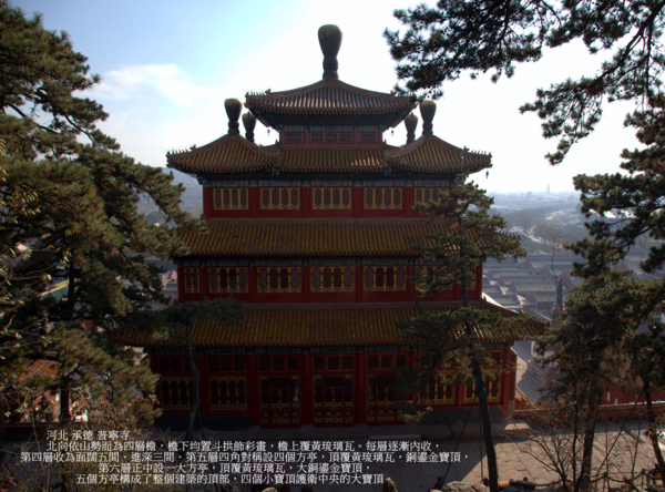 3.四大部洲:大乘之閣的東、西、南、北四方正中,各建有一座形式各異的台殿,稱“四大部洲” 分別供奉四大天王。台殿上下均飾有藏式梯形盲窗,白牆的盲窗塗紅色,紅牆的盲窗塗白色,殿頂均為黃琉璃瓦單簷廡殿頂.