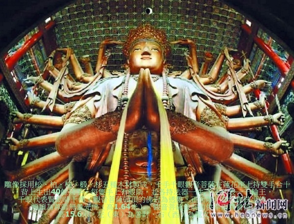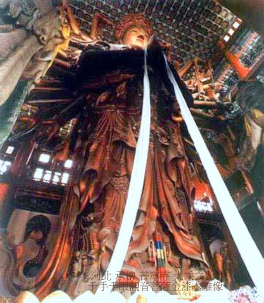 大乘之閣內中空三層,四周設有迴廊,一層東、西山牆以及二層東、南、西牆附設棧板牆,上面有萬佛龕10094個,原來龕中是藏泥鎏金佛,如今均為仿製品共10078尊。閣中矗立一尊金漆木雕千手千眼觀音菩薩,通高27.21米,腰圍15米,重110噸,為世界上現存最高大的木質雕像。雕像採用松、柏、榆、椴、杉五種木材製成,千手千眼觀音菩薩在蓮花座上持雙手合十,背上生出40餘只手,每隻手上有眼隋,並各持法器一件。其造型莊嚴與慈善並舉,紋理流暢通透。觀音菩薩頭頂的佛冠為透雕,正面雕一尊結跏趺坐佛,頭頂為尊師無量光佛(高1.64米)。觀音菩薩像前面供奉兩尊脅侍,高15.6米,左(東)為善財,右(西)為龍女。