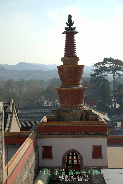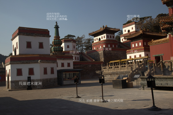 5.四座喇嘛塔; 在大乘之閣的四角各建一座喇嘛塔,四塔象徵佛教「四智」,紅塔(意「妙觀察智」,表示佛能明察善惡,妙觀萬法,位東南)、白塔(意「大圓境智」,表明能辨世界萬象,位西北)、綠塔(意「成所作智」,表皈依佛法即可自利利他,位西南)、黑塔(意「平等性智」,表示世界萬物平等無差別,位東北).四塔均座落在藏式方形白台上,下設塔座。此四塔與普陀宗乘之廟五塔門上兩側的四塔造型雷同,塔身有上下兩個塔肚,上有十三天相輪,上置寶蓋、承露盤、仰月、圓日、火焰寶珠.