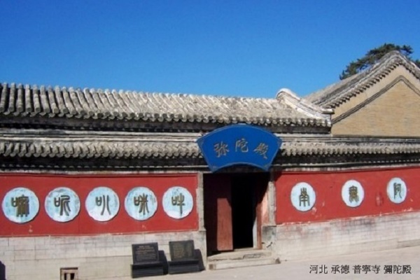 7.彌陀殿:又名往生堂,位於大乘之閣西南,是一個院落。院內南為院門,北面主殿內供奉阿彌陀佛、大勢至菩薩、觀音菩薩。西配殿供奉地藏王菩薩、婆羅門女、閻羅王。東配殿東側的院牆上開門通往大乘之閣院落。三個殿均為青磚灰瓦,硬山頂。出南側的院門有東、西蹬道可下至普寧寺西院的裙房院落。