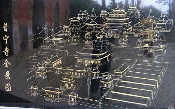 普寧寺建在山坡上,坐北朝南,占地面積33000平方米,有主要建築29座。建築風格獨特,吸收並融合了漢傳佛教和藏傳佛教的寺院建築格局。以大雄寶殿為界,分為前、後兩部分。前半部分為漢傳佛教「伽藍七堂」式布局,中軸線上依次分布著山門、碑亭、天王殿、大雄寶殿等殿堂,兩側為鐘鼓樓和東西配殿。後半部分為藏傳佛教風格的寺廟建築,是仿西藏桑鳶寺而建的藏式曼陀羅。平面有一條南北中軸線貫穿。主要建築有: