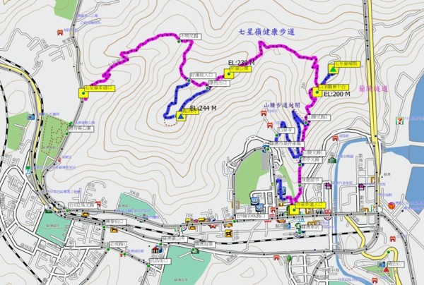七星嶺步道係冷泉入口北向升坡至七星嶺觀景台(EL:200 M)後轉西下陡坡至鞍部,再陡升坡至七星嶺公園(EL:239 M),若再西下則至蘇澳運動公園(聖湖馬場旁)出口,以2D觀之為大寫英文字母M,全長4750公尺.但七星嶺之命名據說為關刀上之七星圖,就欣賞比較看看.