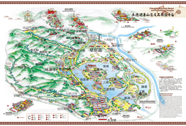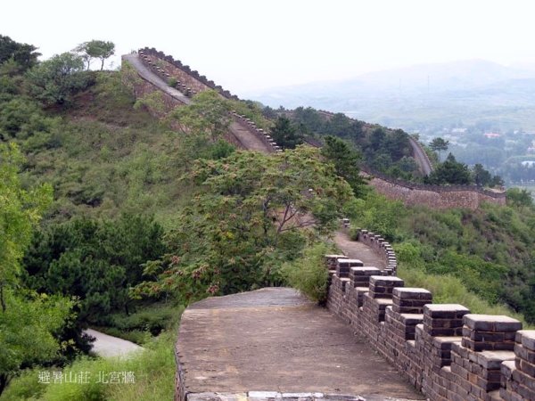 屬於避暑山莊的宮牆.據說是因為可以並行兩匹戰馬,故稱二馬道宮牆,採用當地的虎皮石,各種深淺不同的顏色石材築牆,也稱虎皮城牆.上梯道,達牆頂古俱亭.順山而看,宮牆就像小長城一樣,隨山勢起起伏伏,蜿延而去須彌福壽之廟,是六世班禪的行宮.登高行遠的成果任君巡覽.