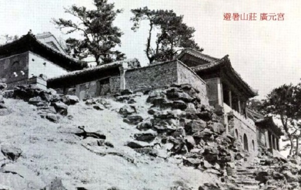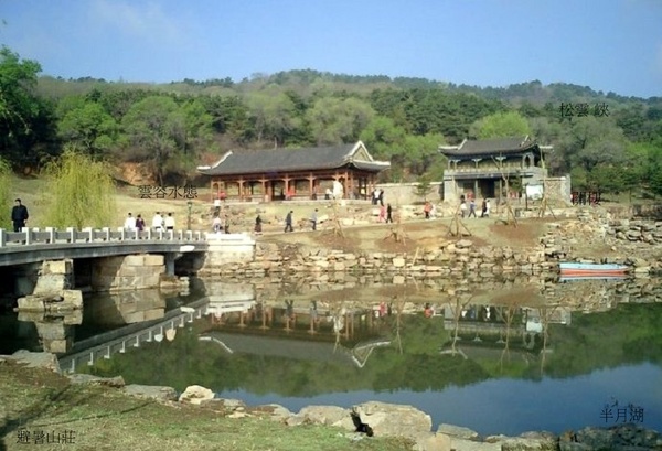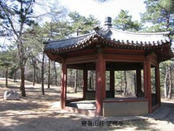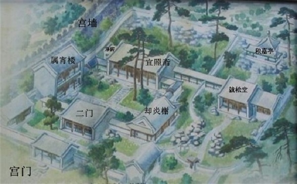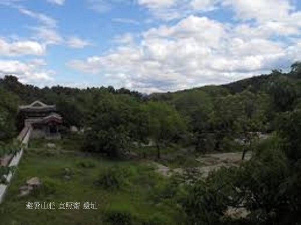 避暑山莊山區宮牆腳下,西北門,宜照齋遺址.宜照齋在西北門旁邊,出西北門可去雍正皇帝的獅子園.主殿五間為「宜照齋」,齋內臨風致爽,清涼別致.齋右為「屬霄樓」,齋左為「卻炎榭」,院後為「積嘉亭」.建築緊鄰西北門,地勢高敞,視野開闊,是松雲峽內一組較大型園林建築.