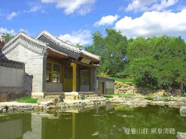 在松鶴清樾之西,有一組建築為風泉清聽,北面有殿五間,名為「秋澄齋」。這裡幽深安靜,溪泉流淌,樹密草深,環境十分優美。每當清風順穀而下,流水之聲更加悅耳。這裡是康熙皇帝到松鶴清樾向皇太后請安時休息的地方.