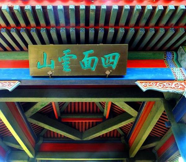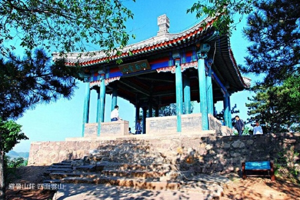 位於避暑山莊西北隅最高處,一峰拔地,構亭其上,聖祖題額『四面雲山』, 聯曰:『山高先得月,嶺峻自來風』,是避暑山莊的最高點. 乾隆皇帝每來山莊,必到此一遊,並觸景生情,寫詩多首。 其中兩句是“絕頂平臨北斗齊,座中惟覺眾山低’’.